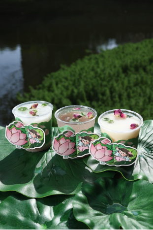 “荷花”系列三款产品分别是:荷戏莲叶间、曲水浮莲叶、莲叶醒山茶。其中最有代表性的要数荷戏莲叶间:清香细腻的菱角泥,搭配糯叽叽的芋圆,融合清爽香甜的椰泰国香椰水、蒟蒻冻,满满江南原香。