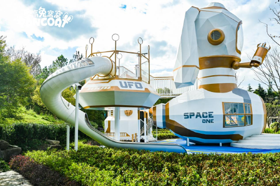 与此同时,乐园内根据原创故事“摘月计划”打造的潮酷游乐设施:探月飞船滑道、摘月城堡、望月兔飞、月亮船等地标与原创故事ip以最大程度融进各个游乐空间,伴随亲子家庭休闲娱乐时光,游乐设备与自然环境的边界也悄悄消融。
