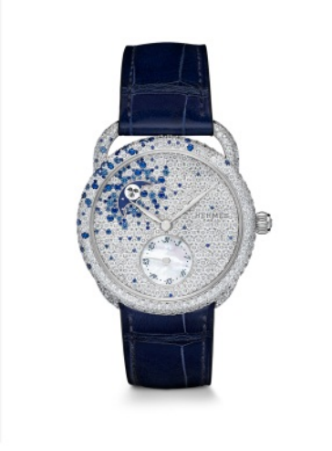 Arceau Petite Lune小月相腕表镶嵌46颗蓝宝石和574颗钻石,在38毫米白金表壳和白金表盘之间璀璨生辉。彷佛被微风吹拂着的蔚蓝宝石簇拥着一轮俏皮的明月,在繁星点点的深蓝天空中闪烁。演化自德籍法裔艺术家爱德华·巴里布德(Édouard Baribeaud)专为爱马仕方巾而设计的经典图案,腕表上月亮的面庞生动而活泼,其灵感正来源于莎士比亚的喜剧 《仲夏夜之梦》。精巧细致的指针飞掠于表盘之上,神秘式镶嵌使月光温柔