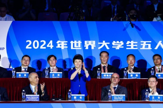 上海市副市长解冬宣布2024年世界大学生五人制足球锦标赛开幕。