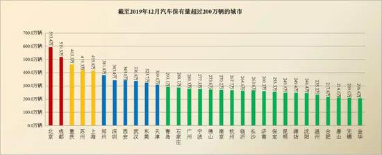截至2019年底,全国汽车保有量达2.6亿辆,与2018年底相比,增加2122万辆(扣除报废注销量),增长8.83%。全国66个城市汽车保有量超过百万辆,30个城市超200万辆,其中,北京、成都、重庆、苏州、上海、郑州、深圳、西安、武汉、东莞、天津等11个城市超300万辆。
