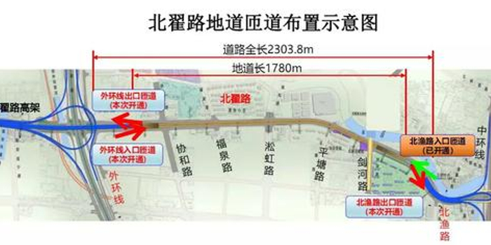 北翟路地道(外环-中环)新建工程在2019年10月25日主线通车、北渔路入口匝道开通的基础上,剩余三根出入口匝道(分别为外环入口、出口和北渔路出口匝道)将于明天(2020年1月15日)建成并开放交通。至此,北翟路地道(含出入口匝道)按规划要求全面实施到位。