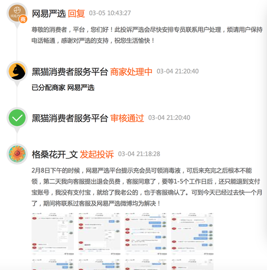 关注[网友投诉:网易严选至今没退还会员费]网友投诉称,2月8日在网易严选平台看见充会员可领消毒液的活动,于是网友花费139元充值了会员,可充完之后根本无法领取。于是网友联系客服提出退会员费,对方同意了,并称1-5个工作日后退回到支付宝账号,但网友至今没收到退款。截至3月6日10时,@网易严选 在黑猫平台作出回应,称会尽快安排专员处理。后续进展,我们将持续关注。投诉详情:https://tousu.sina.com.cn/complaint/view/17348926384/ 黑猫投诉上海站,守护上海人的消费权益,本地投诉入口链接:https://sh.tousu.sina.com.cn