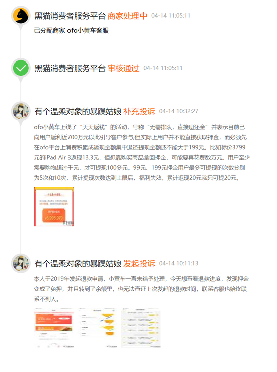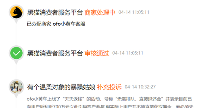 网友投诉:ofo小黄车不退款 且无法联系上人工客服