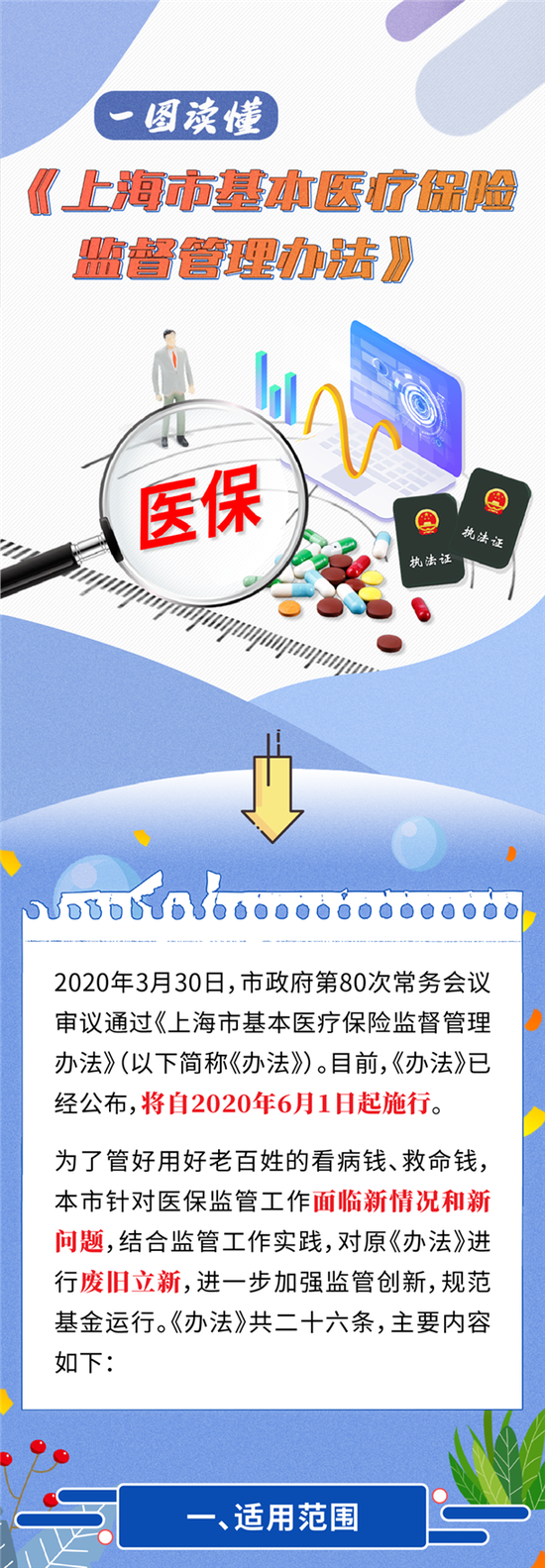 《上海市基本医疗保险监督管理办法》经市政府常务会议审议通过,目前已经正式公布,将于2020年6月1日起施行。医保基金是老百姓的看病钱、救命钱,必须管好用好。随着本市基本医疗保险覆盖面不断扩大,定点医疗机构和零售药店数量不断增加,国家全面推行生育保险与职工基本医疗保险合并实施,试点开展长期护理保险制度等,本市基本医保监督管理面临着新情况,需要对2011年颁布的现行《办法》进行修订,进一步规范和加强基本医保监督管理,通过创新监管方法进一步规范基金运行、维护医保基金安全。《办法》共有26条。