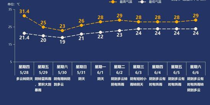 据上海气象部门预计,下周,上海将多阴雨天气,降水较为频繁。气温和本周最大区别是:最低气温的上升,可达24℃左右;日最高气温在28-29℃。