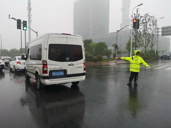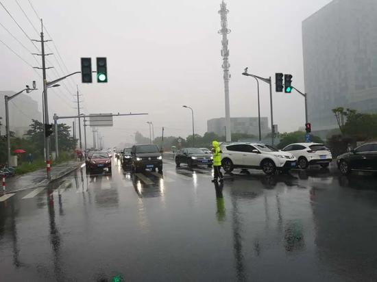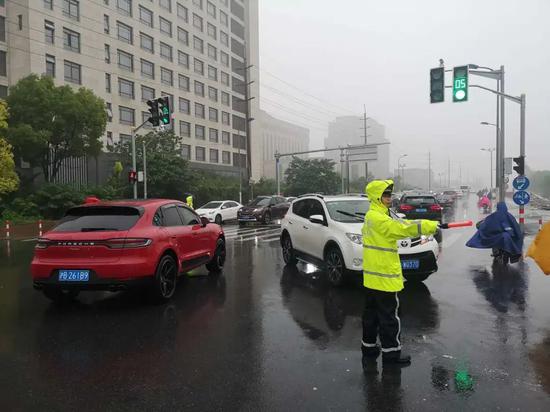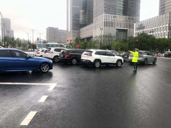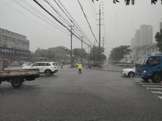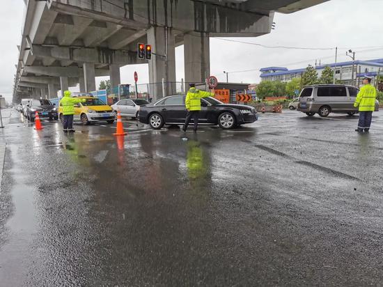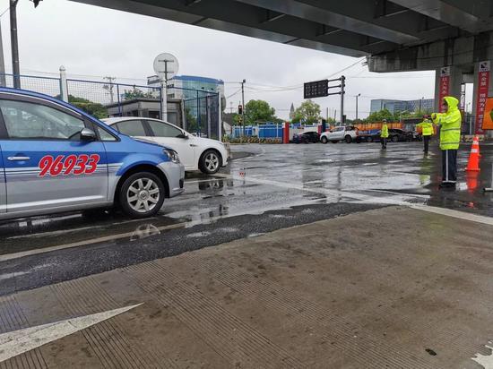 在浦东的各个交通要道及路口,交警也坚守在大雨中。