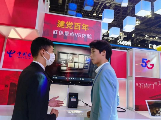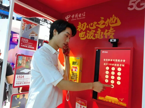 在百年强国路展区,中国电信创造了有“声”有“色”的红色通信沉浸式体验。戴上VR眼镜,瞬间就能从人潮涌动的展会现场进入中共一大、二大、四大会址及上海电信博物馆等红色历史场景;戴上耳机,打开的则是中国电信与喜马拉雅合作搭建的有声图书馆,不少观众在这里驻足聆听红色故事,重温红色历史;触摸滑动历史“时间轴”,可以看到图文并茂的百年红色电信大事记。除了沉浸式的爱国教育,展台现场还设置了一座特殊的电话亭——为党打call亭,供观众以拍照留影的方式,给这场红色数字之旅留下纪念。