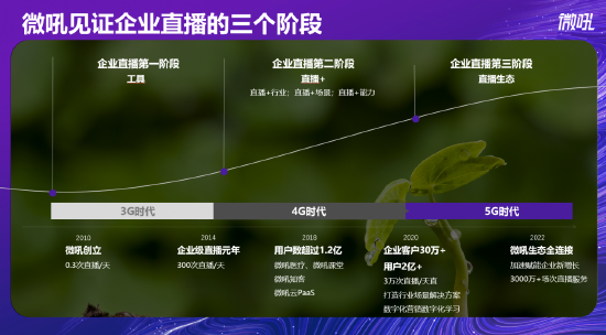 目前,直播成为了企业数字化转型大浪中最受关注的产业之一。若拉长时间线来看,企业直播已经度过了三个阶段。这次大会上,微吼创始人兼CEO林彦廷也对企业直播的几个发展阶段进行了总结。