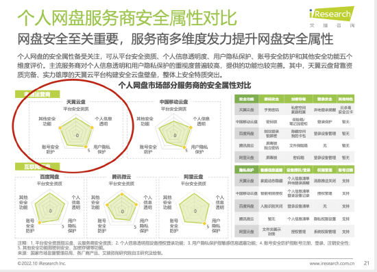 据《2022年中国个人网盘行业研究报告》显示,天翼云盘在个人网盘云业内的安全资质横向对比中,处于领先地位。报告指出:“天翼云盘背靠资质完备、实力雄厚的天翼云平台构建安全云盘壁垒,整体上安全特质突出。”