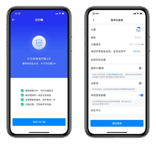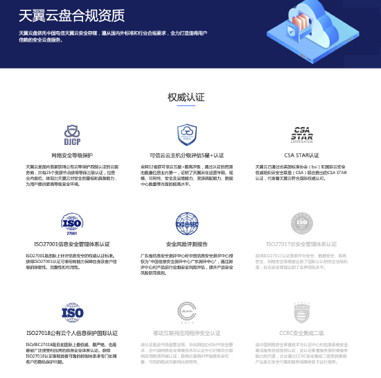 “依托电信三千兆网络,基于海量数据和丰富应用场景,天翼云盘打造个人及家庭数字资产中心,人人一朵云、家家一朵云,推进安全升级,多存储节点获可信云五星+最高评级,网络安全获等保三级及 ISO 等多项国际权威认证,护航用户数据存储安全,在产品安全上拥有免密登录、私密空间、指纹密码、人脸识别、异地登录提醒、云杀毒等特色功能,成为安全云盘国家队,值得信赖。”