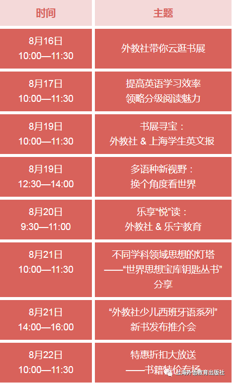 备受期待的上海书展将于8月16—22日正式开展。本次书展期间,上海外语教育出版社将携数千种精选好书,邀名家大咖一起,在现场和云端为读者朋友们献上阅读盛宴。线下每天还有词汇测试荐书活动哦~