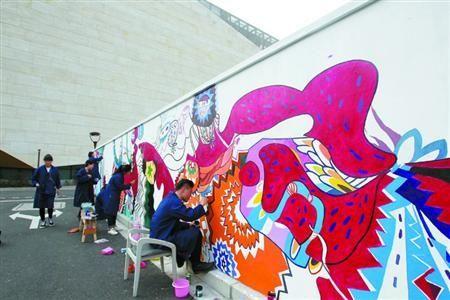 迁址于延安西路凯桥绿地的刘海粟美术馆新馆,今年3月19日开始试运行。而一条在新馆外墙、由一批艺术家挑灯夜绘的300米涂鸦墙,引起不少市民注意。这是“新生代互联网原创艺术家推荐展”的展览内容 之一。涂鸦作品由上海大学美术学院油画系、设计系的大学生担纲完成。300米涂鸦墙,将会成为每年一次的互联网原创艺术大展提供的城市公共艺术空间,并且 会一直保留下去,成为刘海粟美术馆的“户外公共展厅”,每年都会重新画上重点艺术家的作品。