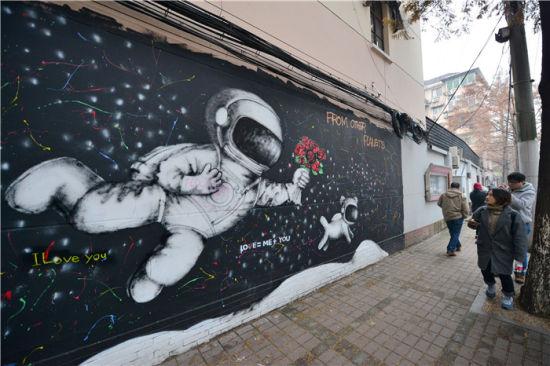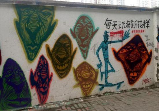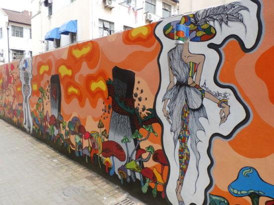 这是一条相当不起眼的老旧弄堂,但因这些多彩而富有创意的涂鸦,让寻常的弄堂里多了一道道靓丽的风景线,这里的涂鸦爱好者喜欢在老式棚户房墙上喷涂上色彩艳丽、构思巧妙的作品,居民们也对涂鸦感到新奇,认为美化了他们的居住环境。