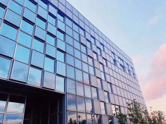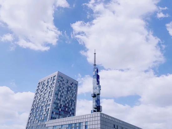1号口出来转个方向,那座“马赛克大楼”就是我们所在的浦东新区融媒体中心啦!有花有草有小鸟,蓝天白云配上大楼,我们超美的!不信你看!