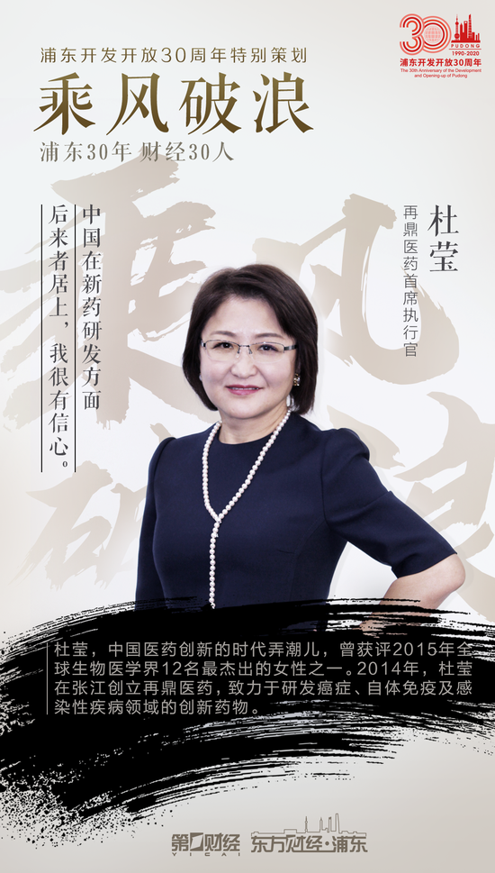 1994年,杜莹在美国辉瑞开始了职业生涯。2002年,杜莹归国回到上海,在张江创办和记黄埔医药(上海)有限公司,10年间创造了医药领域的多个本土第一。2014年,杜莹再次创业,在张江成立再鼎医药,致力于研发癌症、自体免疫及感染性疾病领域的创新药物。2017年,再鼎全球研发总部落户张江。“我们走得早一步,年纪不算很大,爬到了山顶,人生不可能停在那儿。”杜莹正带领再鼎医药再一次攀登生物医药界的“珠穆朗玛峰”。
