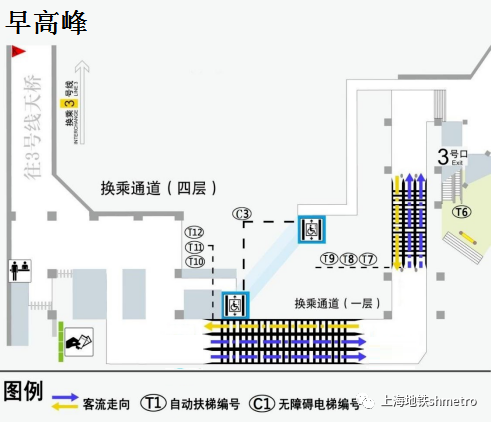 早高峰期间(3号线换乘8号线)长扶梯采取两下一上的走向。