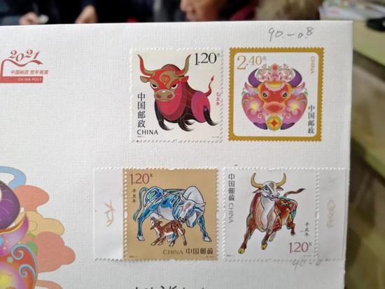 一位邮迷在纪念封上贴上了自己收集的好几轮“牛票”,颇有“牛气冲天”的意味。还有邮迷把“牛票”和去年的“鼠票”贴在一块儿,与加盖的“鼠牛生肖交替”纪念戳相互映衬,寓意辞旧迎新。在现场,还能看到很多带着厚厚一沓信封、明信片,自备印泥前来加盖纪念邮戳的市民,用专属于邮迷的特别方式将祝福送往全国各地。