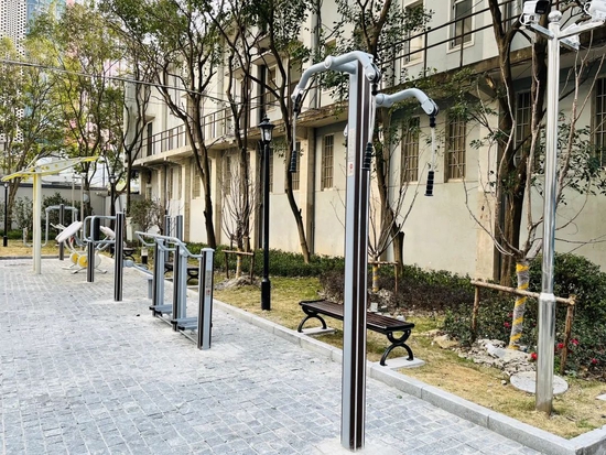 改造工程还优化了居民的休闲锻炼空间,新增步道和健身器材,并在小区绿化带设置休闲廊架和座椅,供居民休憩。