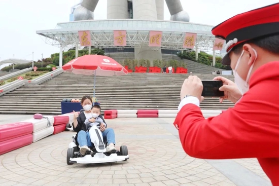 从嘉定赶来的赵女士,带着孩子坐地铁过来。“很方便,不到一个小时就到了。准备带儿子开一开室外广场上的卡丁车,让他好好开心一下。”她说。