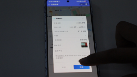 这里不仅地势低易监测,旁边也有足够的空间摆放防台防汛物资。这个设备平时是绿灯常亮的状态,如果发生雨水倒灌入车库,水位达到一定高度时,监测设备就会亮起红灯,系统将自动向“微平台”发出告警,并同步形成工单推送至联勤联动“小程序”,提醒处置人员立即前往现场开展应急处置工作。