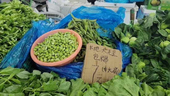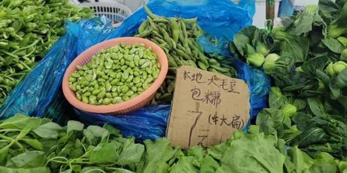 小虹在三角地密云菜场看到,每家蔬菜摊位上都无一例外地出现了毛豆的身影,牌子上也清楚地写明了毛豆的品种是本地的“牛大扁”。