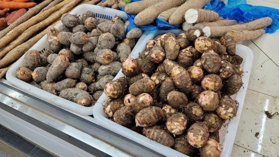 “芋头八块钱一斤,削过皮的十块钱一斤。”一位摊主招揽着生意,他告诉小虹,今年的芋艿大多产自浙江金华,虽然个头比较小,可口感却十分软糯鲜甜。今年雨水不多,芋艿在品质方面有一定的提升,水煮后口感僵硬的情况较少。