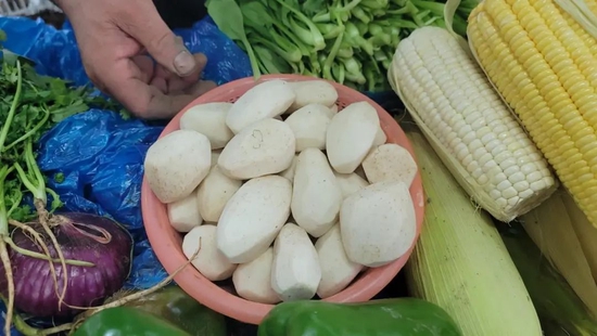 摊主一边将手中芋艿沾满泥土的皮削去,把它们变成一个个雪白的“小胖子”,一边向小虹介绍道:“今年价格要贵一点,但是最近几天都卖得不错。”