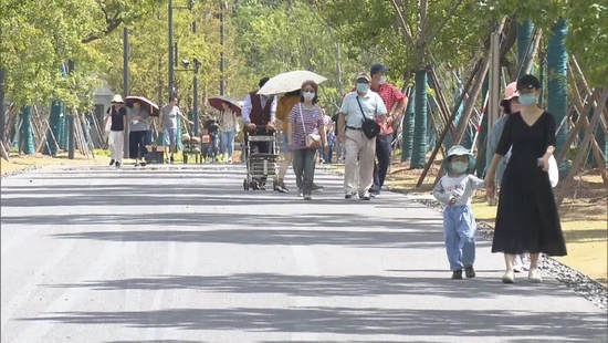 不少人牵着孩子,陪伴着家人、朋友,或漫步在公园的小路上,或在树荫下的长椅休憩,放下生活工作的压力,感受秋日里的慢时光。