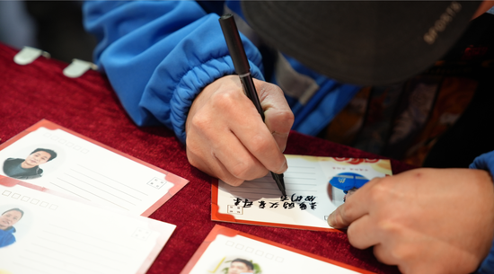每位参与活动的外来务工人员还都收获了一张印有自己照片的明信片,“小哥”们在明信片上写下对家人的祝福后,这些卡片将由主办方为他们寄回家乡。