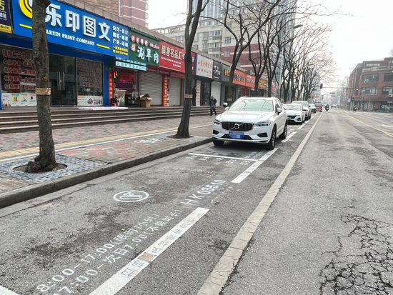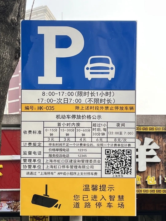 记者在天虹路看到,在路边每个停车位的地面上,都清晰地标示了车位编码,并提示市民扫描二维码自助缴费。根据智慧停车公示牌,这里的停车收费标准为:0-15分钟3元,15-30分钟3元,30-60分钟4元,超过1小时按每30分钟6元累计。在时段上,白天8:00至17:00限时停车1小时,17:00至次日7:00不限时长。