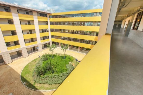 进才繁荣实验中学占地面积35180平方米,主体建筑为“中”字形,所有教学空间均可通过连廊抵达。无论天气如何,师生都能在校内畅行。学校外立面主体色彩为灰色和黄色,与“辉煌”同音。现代化的综合楼、体育馆、图书馆、教学实验室,设施完备的心理室、美术室、音乐室、舞蹈房、劳技室等高标准教育教学设施,为师生提供学习、休憩、运动、交流、展示的场所。小布发现,走廊上、楼梯口,具有进北特色的校园文明提示语也已张贴到位。