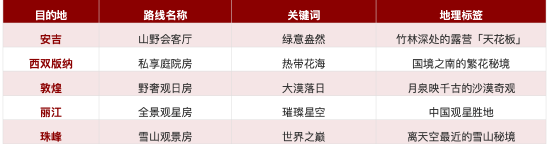 在丽江全景观星房,配备天文望远镜与全开顶帐篷——白天遮光静谧,夜晚仰望星河,感受‘今夜就住进星空里’的沉浸体验。珠峰雪山观景房,以海拔8848m主题装置搭配大师系列顶配装备,让人身临世界之巅,感受雪山之上的壮阔力量。敦煌野奢观日房,以仙人掌造景还原大漠意境,配合轻量帐篷,带来极致留白的沙漠美学体验。西双版纳私享庭院房,选用DARKROOM黑胶天幕(紫外线隔绝99.99%),专为亲子家庭打造,在热带花海中享受舒适安心的遮阳空间。安吉山野会客厅,欢迎毛孩子同行,绿水青山间与家人、爱宠共享山野时光。