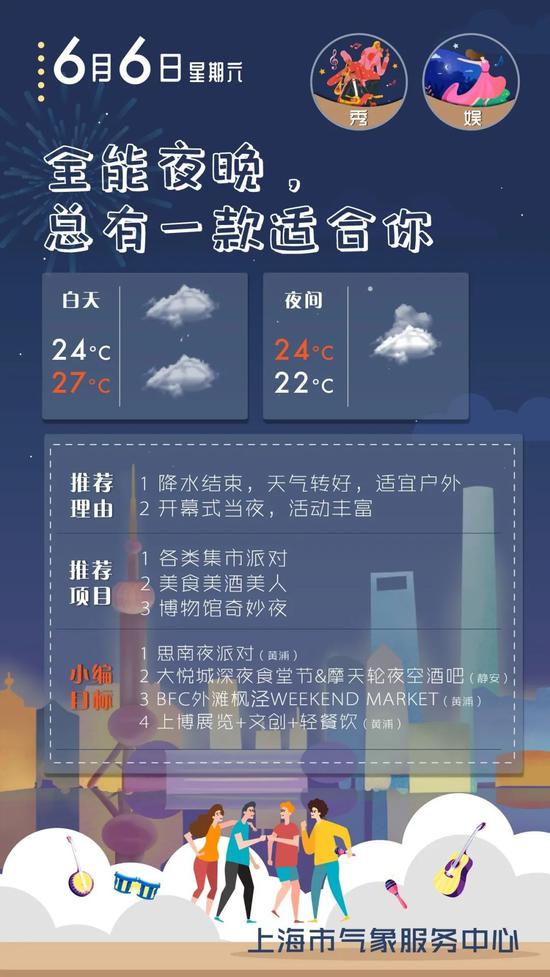 6月6日至30日,上海将举办首届夜生活节,涵盖夜购、夜食、夜游、夜娱、夜秀、夜读六大主题的180项重点特色活动。6月5日-7日的具体天气如何?上海气象部门专门整理了一份“天气版”夜游日历,供大家参考。