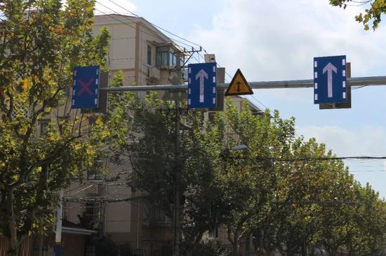 针对此情况,公安虹口分局交警支队将该路段的机动车道适当拓宽,并在原有的两条车道的基础上增加了一条机动车道,将三条车道调整为“潮汐车道”。