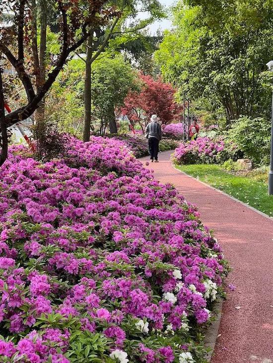 沿线主要种植的杜鹃品种为山杜鹃、安酷杜鹃、比利时杜鹃、白毛杜鹃等,共同绘制了一幅绚烂的春日画卷。