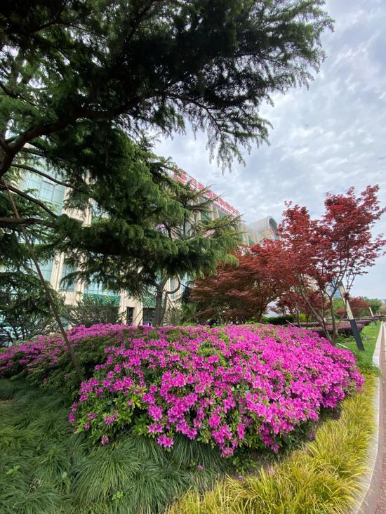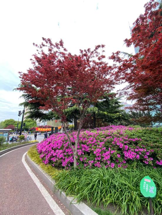 桂江路沿线种植了杜鹃新品种御代之荣,花期多在4月至5月初,为一类大叶大花类,是华东、华南地区绿地常栽品种类型,淡淡的粉色花瓣在微风中轻轻摇曳,为春日增添了几分浪漫色彩。