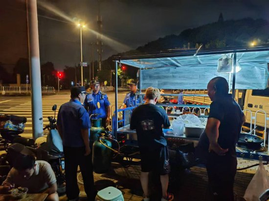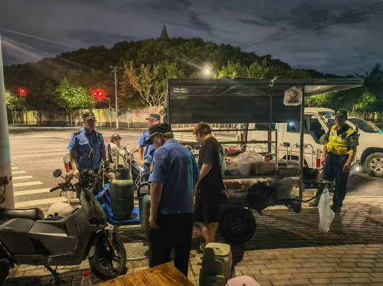 取缔无证无照占道经营:根据排摸,华济路和华展路是无证无照占道设摊较突出的路段。晚21时,两地执法队员及特保辅助人员同时抵达现场,以雷霆之势迅速出击控制住流动设摊点,依法进行取证及物品暂扣,短时间内排除了妨碍,确保道路通畅,行动中共取缔4家无证无照摊贩,有效震慑了流动摊贩跨区域“打游击”现象。