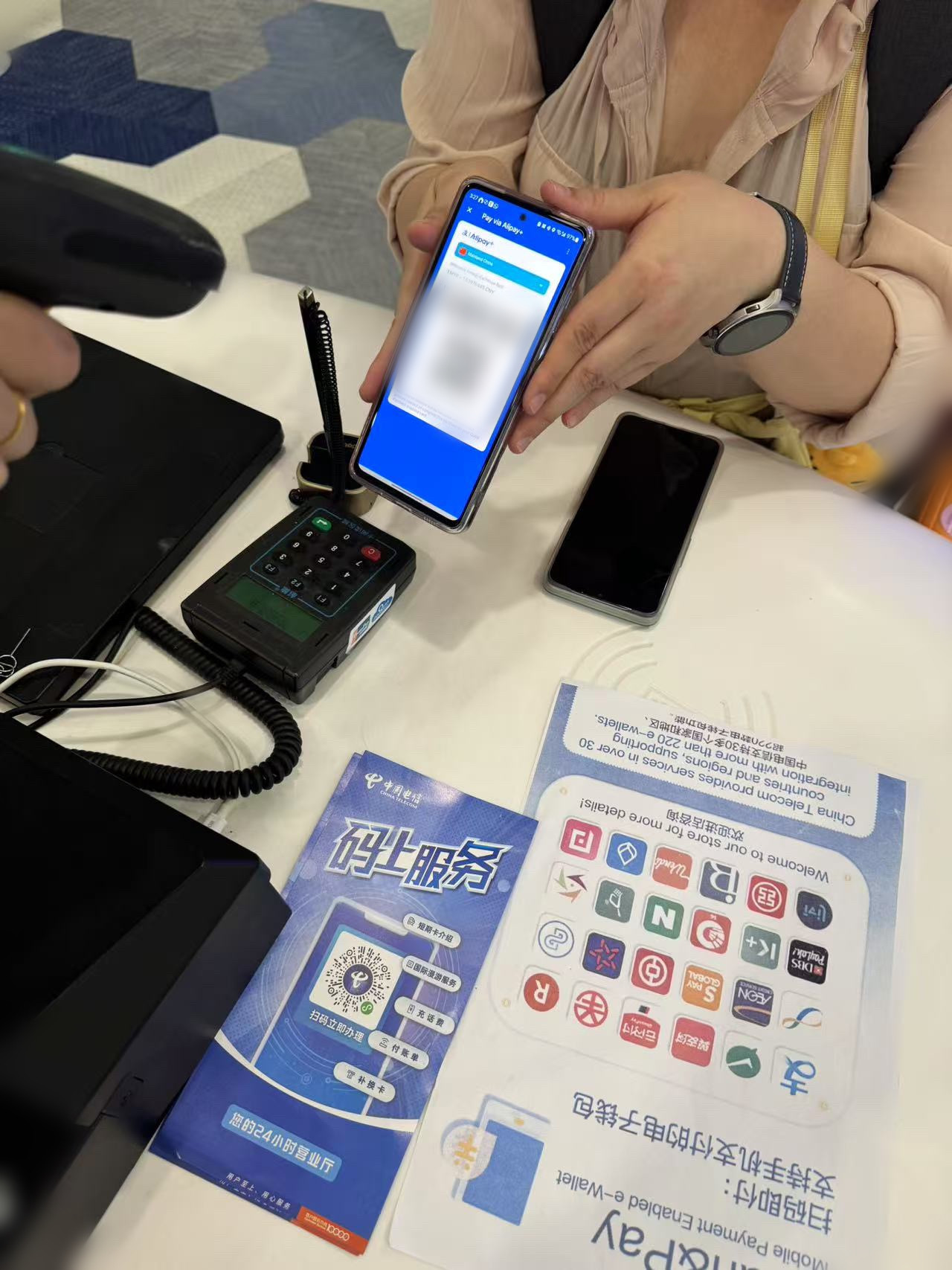 这是中国电信聚合支付的“第一单”。不少前来办理短期卡的入境游客都感叹道:“在中国使用扫码支付实在太方便了!”