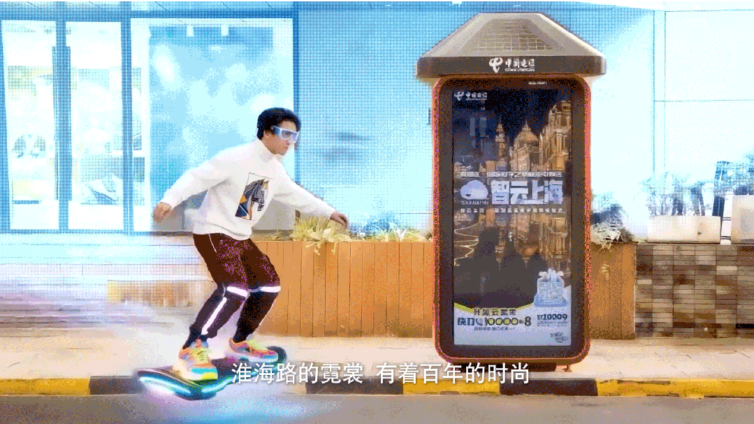 除了核心彩蛋与人物设计,短片中还暗藏诸多巧妙植入,处处彰显电信元素:美好家、天翼智屏自然融入家庭场景;“万兆”浪花的设计,将文字隐藏在浪花之中,既贴合“踏上万兆的浪”的歌词,也强化了电信网络引领潮头的意向;滑板少年穿越TX淮海门前数字公话亭的实景画面,既展现了城市的青春活力,也唤起人们对身边公话亭的记忆;世纪大道上上海电信总部大楼的“出镜”,则彰显了电信作为人民城市建设者的角色担当。