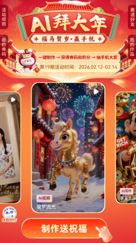 今年春节,天翼智铃正在成为Z世代和家庭用户的“新年俗”:用户在小程序中完成制作视频、发送分享红包、邀请好友等各种任务后,均可以获得次数不等的抽奖机会,赢得话费红包、流量红包、手机等各类奖励,而生成的视频,更可以一键设置为自己的来电彩铃。