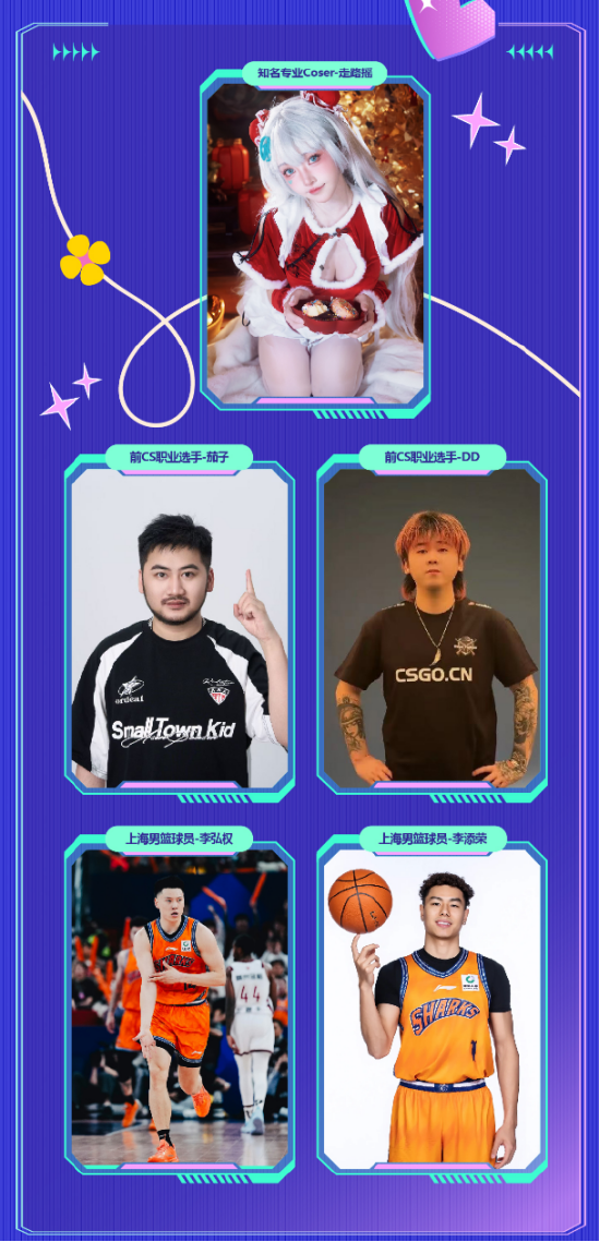 大咖面基与绝美开场:众多人气Coser将带来惊艳的元气开场秀,打破次元结界。知名专业Coser走路摇、前CS职业选手茄子与DD、上海男篮现役球员李弘权及李添荣将相继登场,与现场粉丝展开零距离的亲密互动。高能对决:茄子和DD将分别带领现场观众展开激烈的CS趣味道具赛。同时,备受瞩目的“星途运动会”将呈现创新形式的虚拟电竞与现实体育巅峰对决,看点十足。