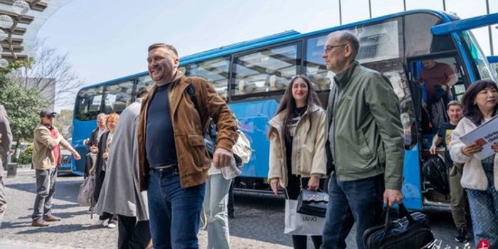 昨天11:40许,两辆载着61名俄罗斯游客的蓝色大巴先后驶抵上海中心J酒店。游客们一下车,便收到了地接旅行社、酒店工作人员的热情迎接:“Welcome to Shanghai!(欢迎来上海)”