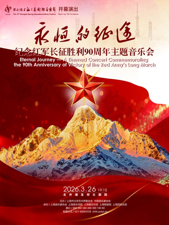 3月26日晚,音乐节开幕演出《永恒的征途 ——纪念红军长征胜利90周年主题音乐会》将在北外滩友邦大剧院上演,集结长征沿线七省优秀艺术家联合演出,汇聚廖昌永、石倚洁、于丽红、徐晓英等名家以及顾文梦、张曦、冯浩然等新秀。音乐会由指挥家张国勇执棒,上海爱乐乐团、上海歌剧院合唱团、上海音乐学院交响乐团及合唱团、上海民族乐团等院团优秀演奏家联袂参演。