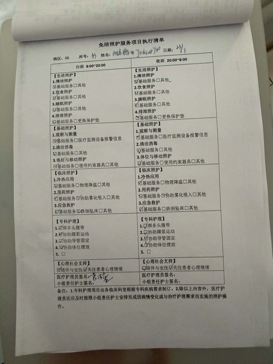 “过去,我们需要24小时工作,现在是12个小时一班,我们也有了上下班概念。”45岁的护理员张炳霞感受到,如今陪护服务的流程更专业、更规,“范从护理部下达任务,到完成每一项工作,都可以数字化显示,工作做得好不好,护士长还会打分,作为绩效考核的一部分。”