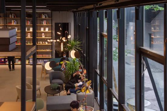 “城市不眠24小时书店”拥有高颜值的玻璃幕墙,天光云影在幕墙上交汇,阳光照射到店里顶天立地的书墙,散发出令人安心的温度~
