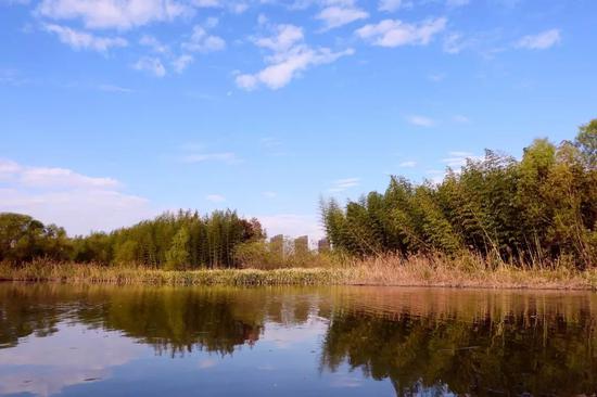 秋日的天空格外澄澈,倒映在水中,秋水共长天一色,美不胜收。