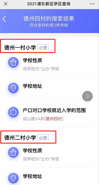 在输入框内输入要查询的浦东的小区或居村委会的名称,就会有相应的搜索结果出现。包括学校的性质、地址以及户口对口学校就近入学的范围。