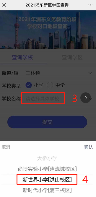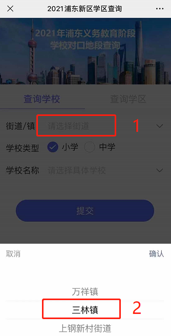 先选择所在“街道/镇”,然后选择相应的学校即可跳出查询结果。